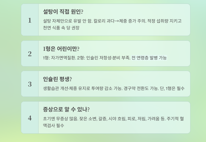 1형 당뇨병은 췌장의 베타세포가 파괴되는 자가면역질환입니다. 2형 당뇨병은 인슐린 저항성 증가와 분비 부족으로 발생합니다. 중요한 사실은 1형과 2형 당뇨병 모두 전 연령층에서 발병할 수 있다는 점입니다.