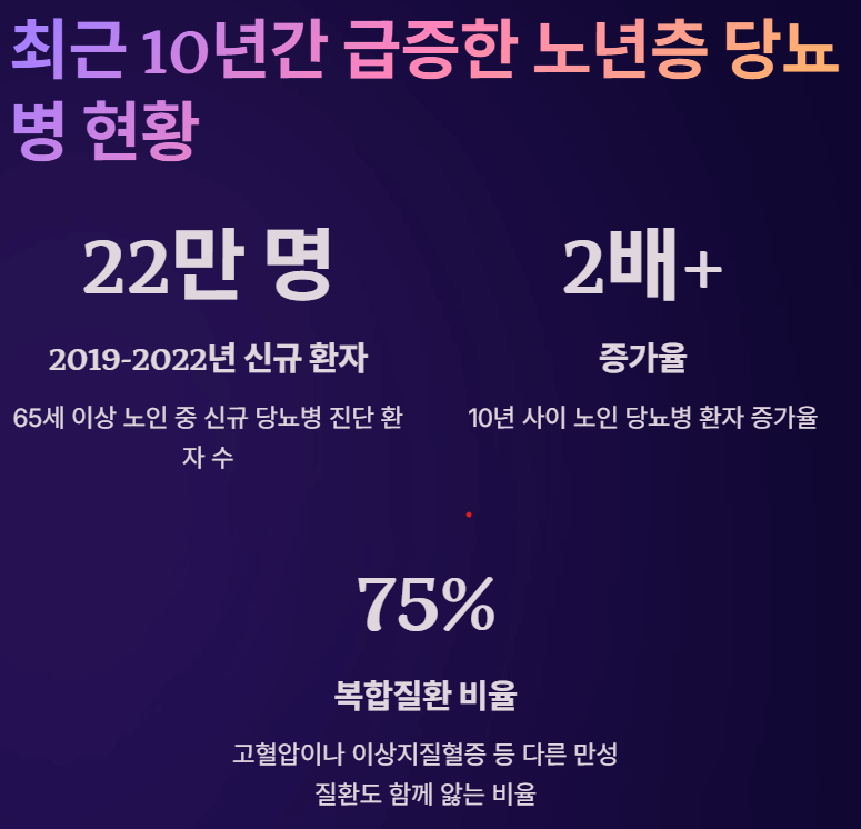 이처럼 복합적인 건강 문제를 가진 노년층 당뇨병 환자가 급증하면서 의료계에서는 노인 맞춤형 당뇨 관리의 중요성이 더욱 강조되고 있습니다.